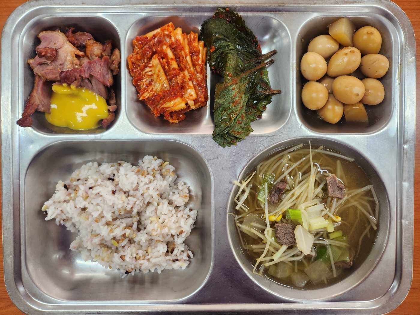 [조식] 친환경잡곡밥, 쇠고기무국, 훈제오리/머스타드s, 메추리알곤약조림, 양념깻잎지, 배추김치