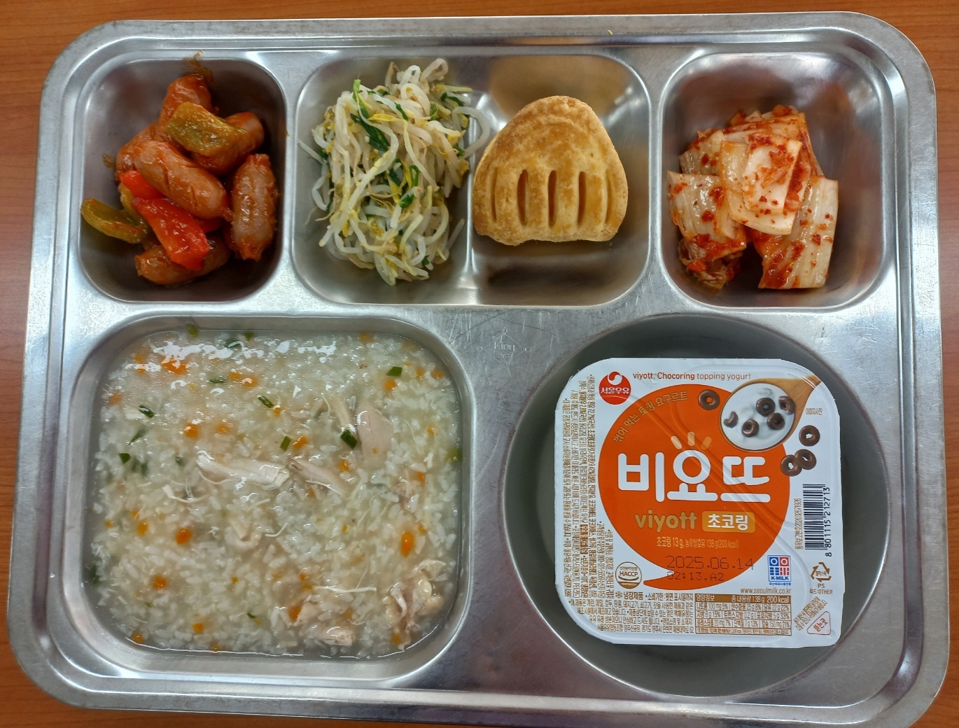 [조식] 영양닭야채죽, 비엔나케찹조림, 부추숙주나물, 배추김치, 미니사과파이, 비요뜨