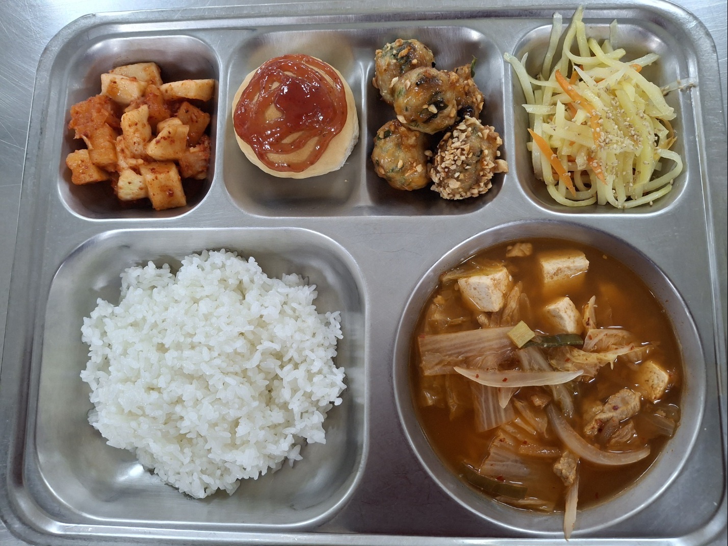 [조식] 친환경찹쌀밥, 돈육김치찌개, 굴림만두강정, 감자채볶음, 모닝빵*딸기쨈, 깍두기