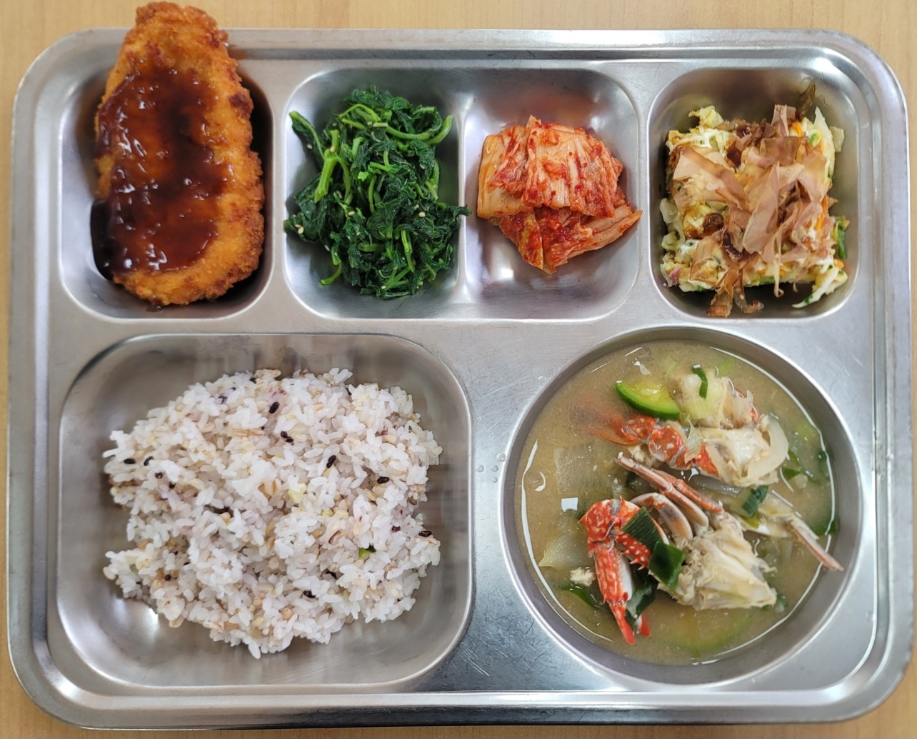 [석식] 친환경잡곡밥, 꽃게두부된장국, 통살치킨까스, 오꼬노미야끼, 깨순나물, 배추김치