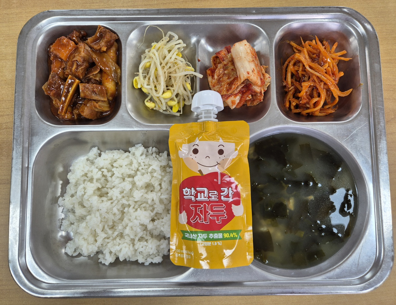[중식] 친환경찹쌀밥, 황태미역국, 동인동식찜갈비, 일미도라지무침, 콩나물무침, 배추김치, 학교로간주스
