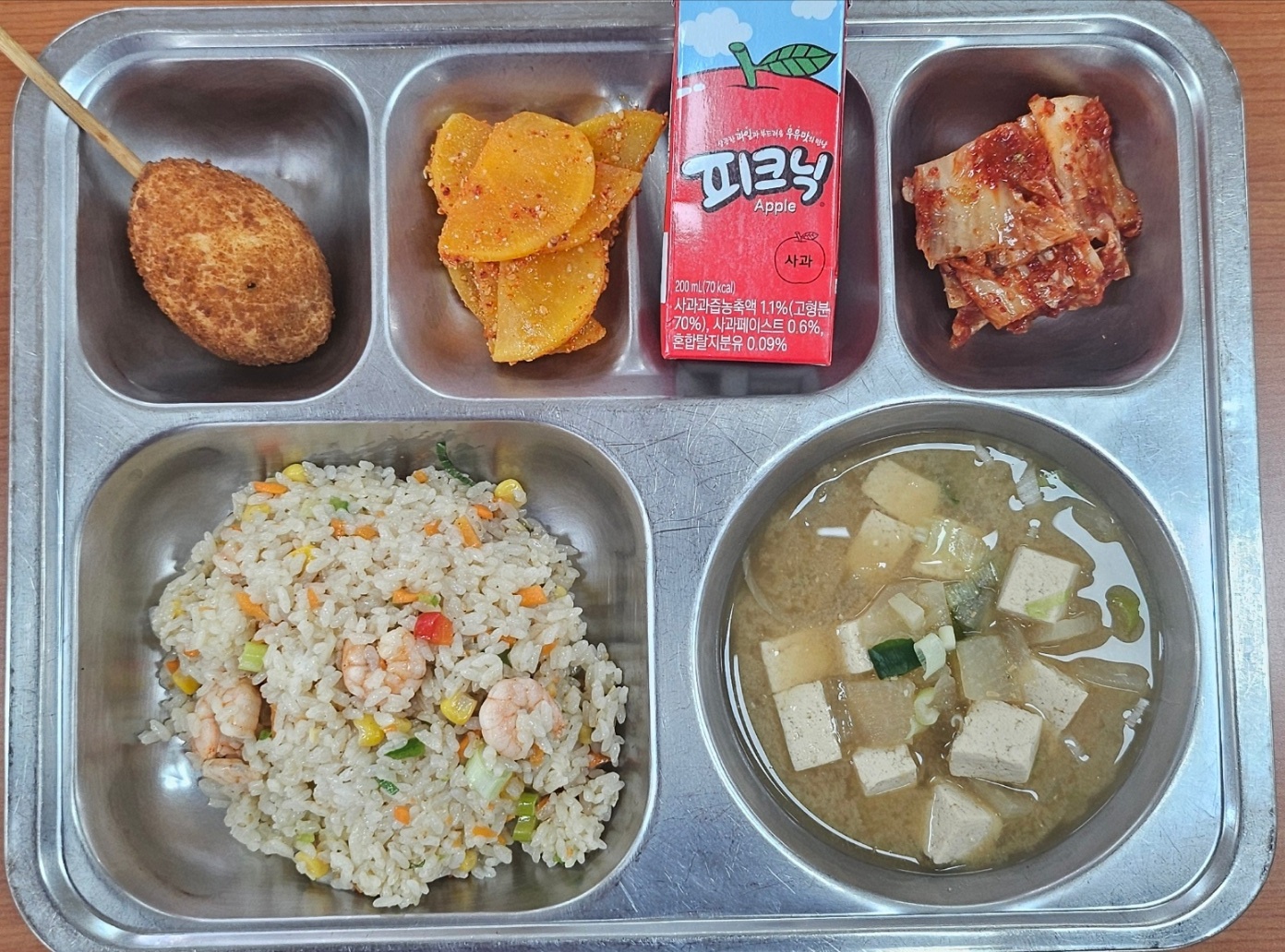 [조식] 새우볶음밥, 건새우다시마무국, 탱글뽀득핫도그/케찹, 단무지무침, 배추김치,피크닉