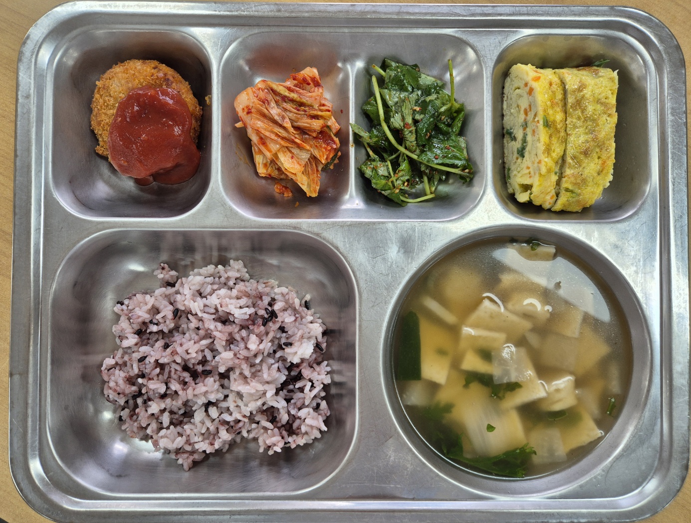 [중식] 찹쌀흑미밥, 모듬어묵국, 김치치즈피자볼카츠, 달걀말이, 참나물겉절이, 배추김치