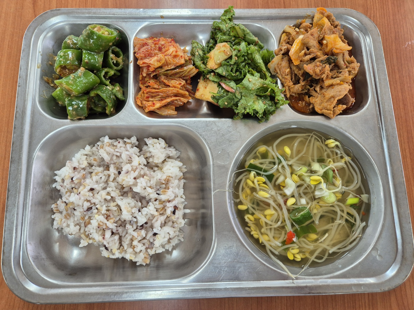 [석식] 친환경잡곡밥, 얼큰콩나물국, 아삭고추된장무침, 치커리사과무침, 배추김치