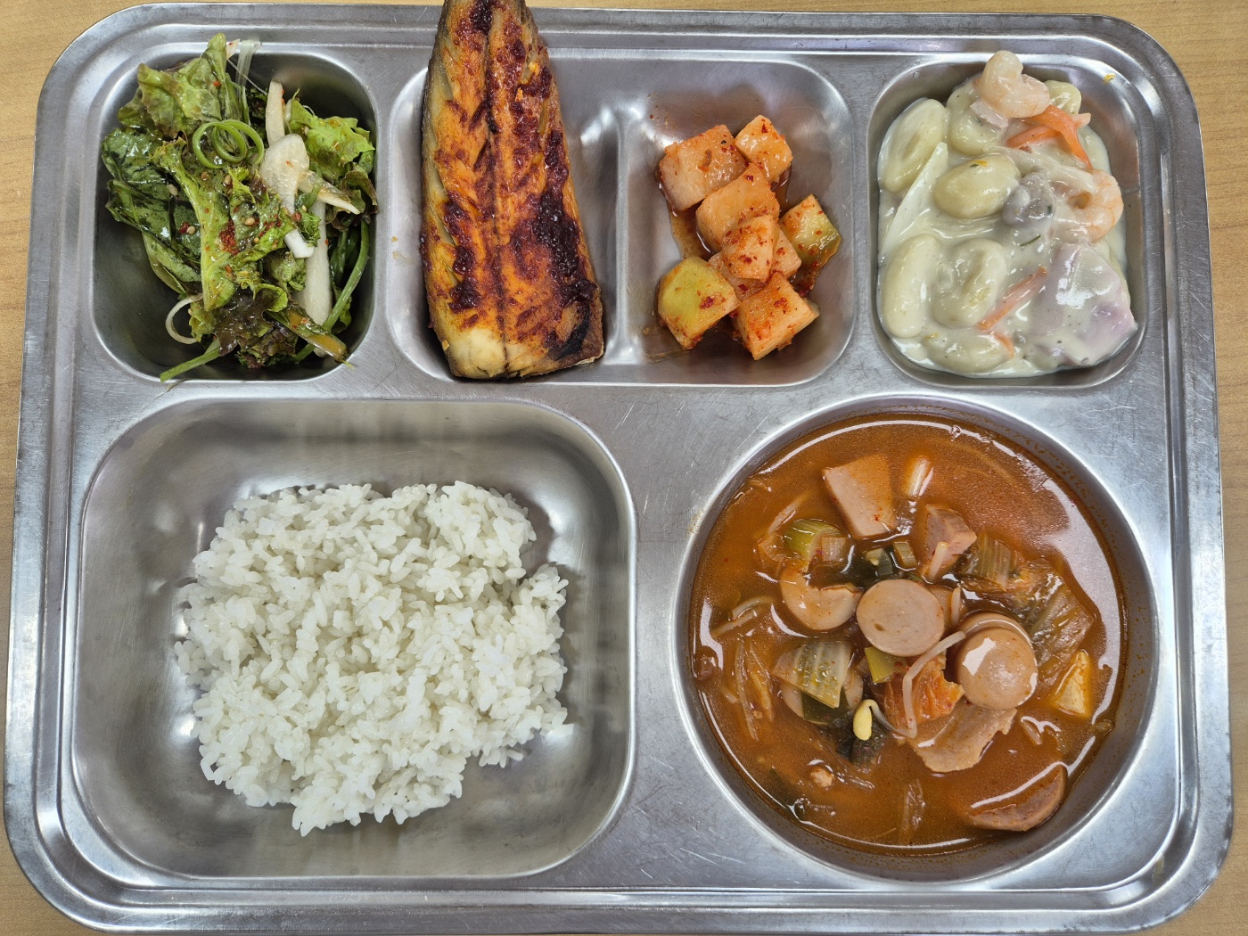 [중식] 친환경찹쌀밥, 부대찌개, 고등어구이(자율), 크림소스감자뇨끼, 상추파겉절이, 깍두기