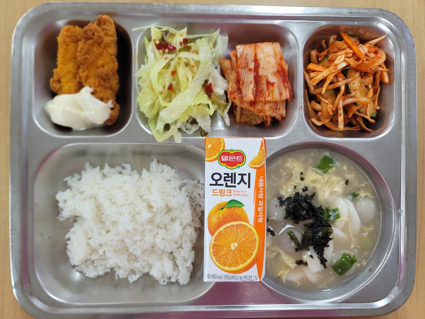 [석식] 친환경찹쌀밥, 새알심만두떡국, 치킨텐더유린기, 오징어초무침, 배추김치, 오렌지드링크