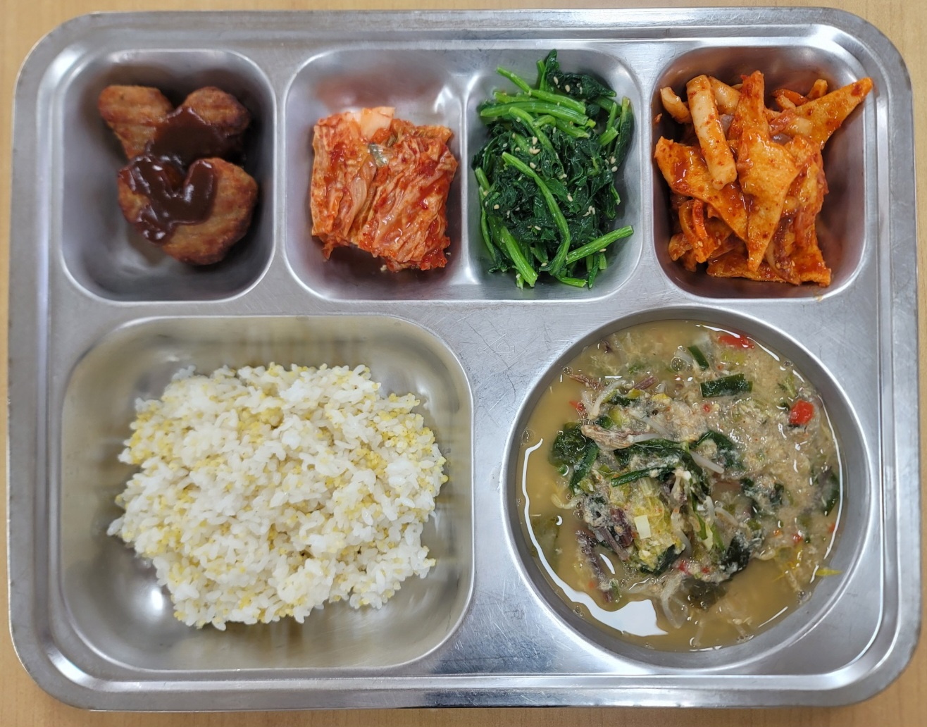 [석식] 기장밥, 장어국, 하트미니함박, 충무식오징어어묵무침, 시금치나물(자율), 배추김치