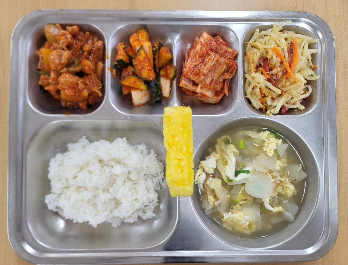 [중식] 친환경찹쌀밥, 황태계란국, 춘천식닭갈비, 햄감자채볶음, 오이양파무침, 배추김치,