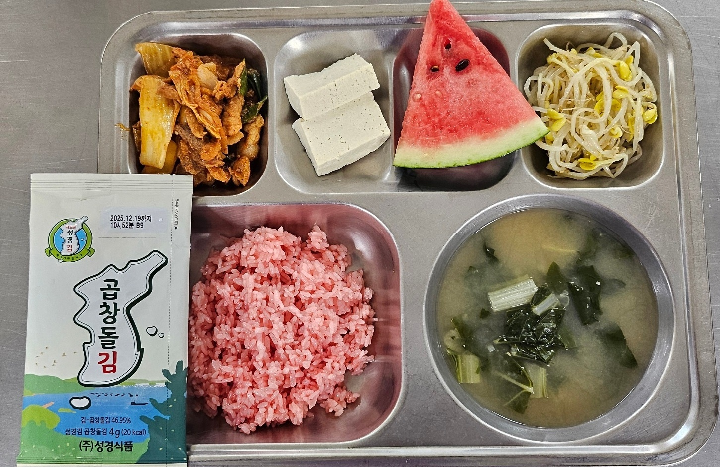 [조식] 홍국쌀밥, 근대된장국, 돈육김치볶음*온두부, 콩나물무침, 곱창돌김, 수박