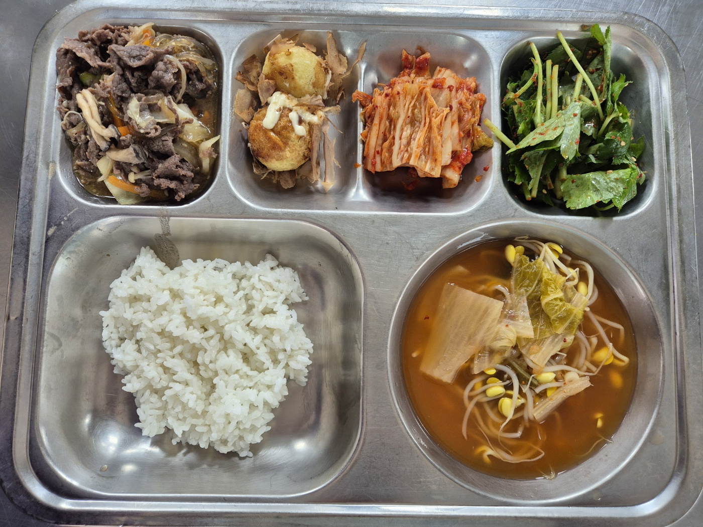 [석식] 친환경찹쌀밥, 김치콩나물국, 한우버섯당면볶음, 타코야끼, 참나물겉절이, 배추김치