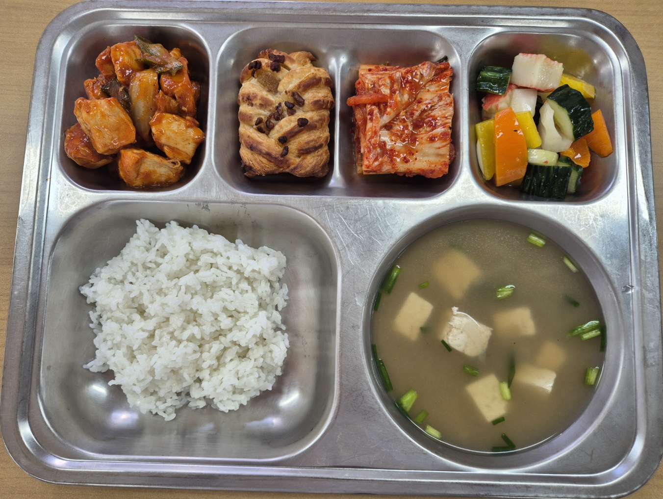 [석식] 친환경찹쌀밥, 들깨무채국, 맵코바치킨, 오이꽃맛살냉채, 메이플피칸파이, 배추김치
