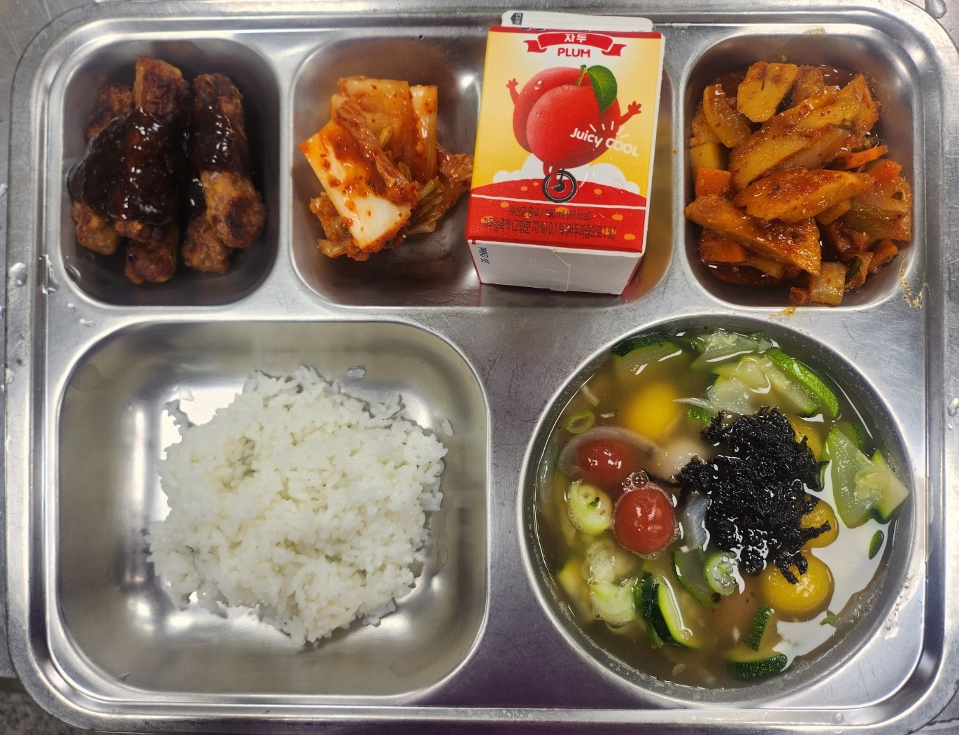 [조식] 친환경찹쌀밥, 삼색감자옹심이국, 떡갈비스틱구이, 부들어묵볶음, 배추김치, 쥬시쿨(자두)