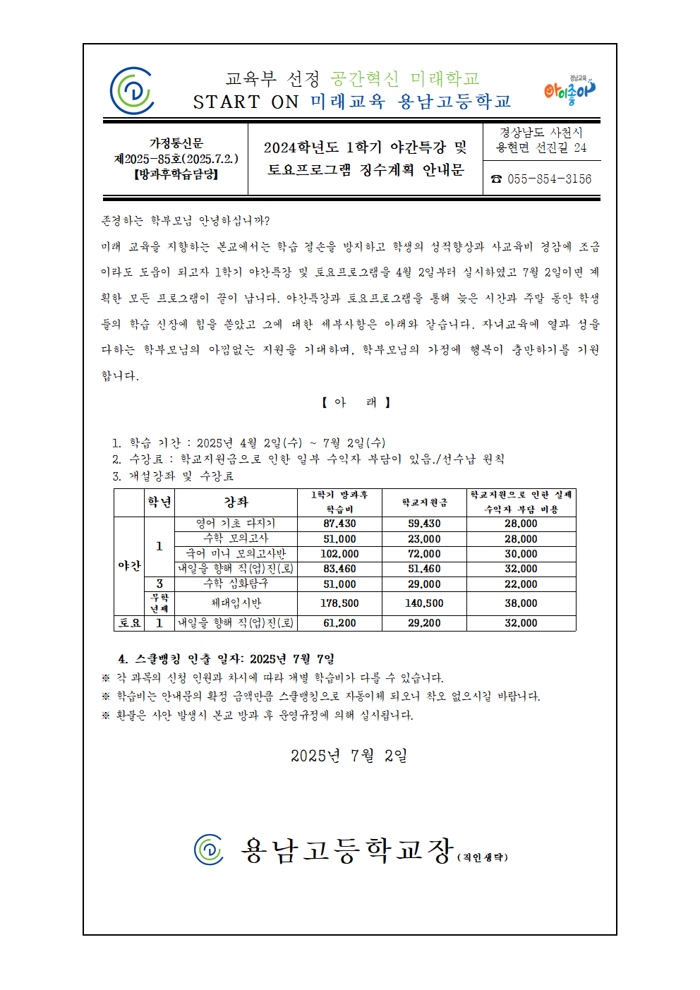 [제2025-84호] 2025년 1학기 방과후수업 징수계획 안내문