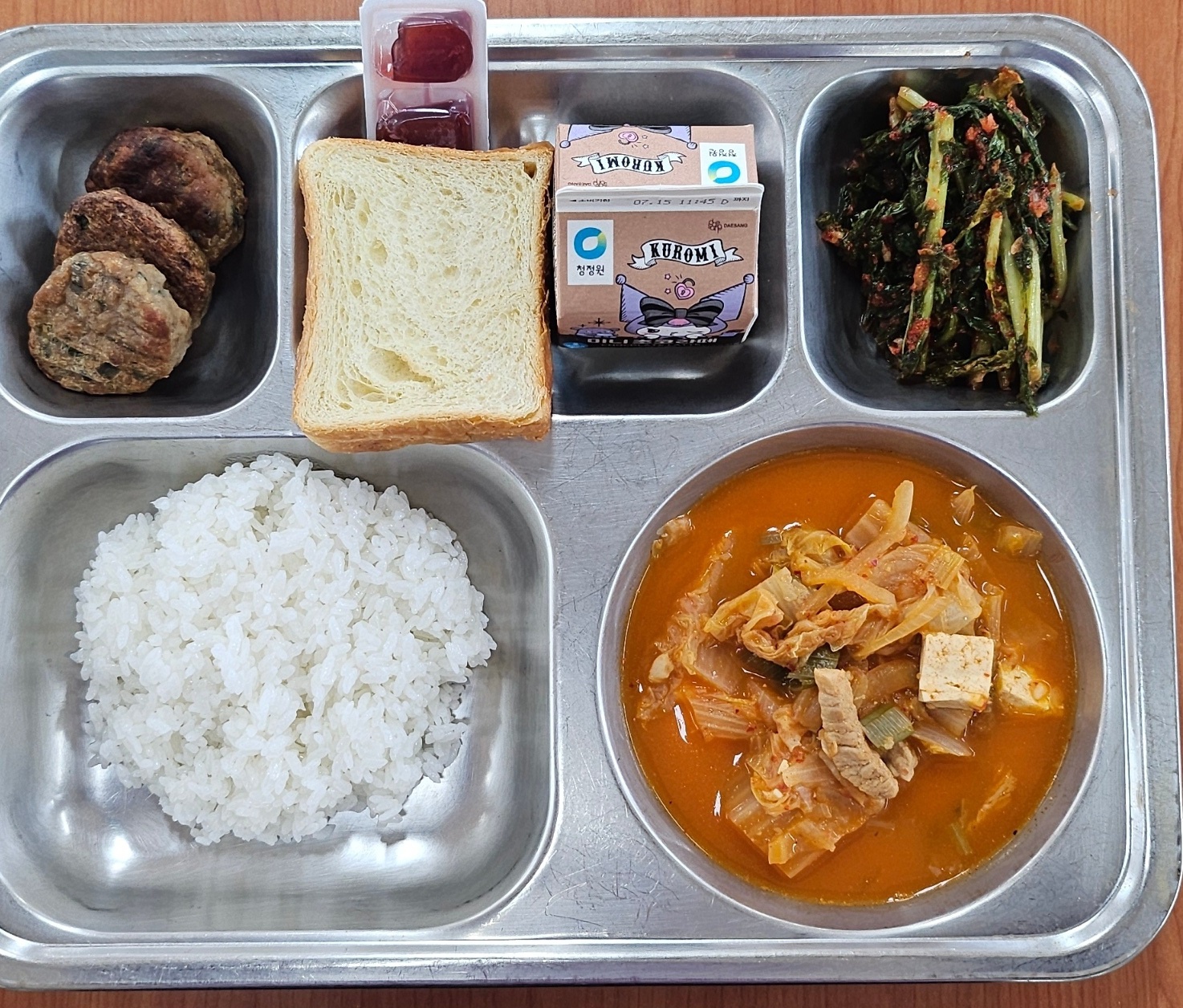 [조식] 친환경찹쌀밥, 돈육김치찌개, 오색현미육원전, 열무김치, 데니쉬조각식빵*딸기쨈, 미니초코라떼