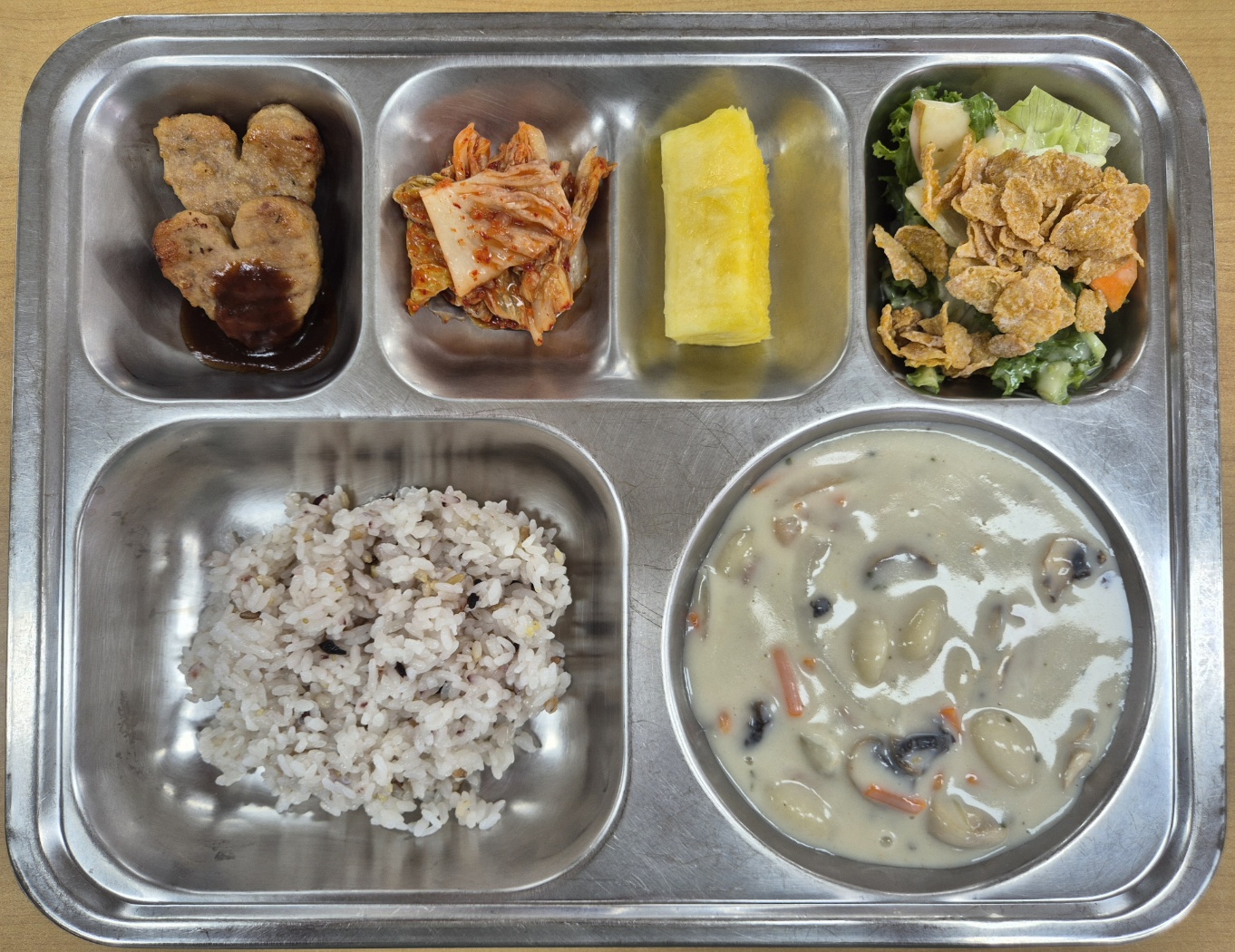 [석식] 친환경잡곡밥, 크림소스감자뇨끼, 하트미니함박, 시리얼치커리샐러드, 배추김치, 파인애플