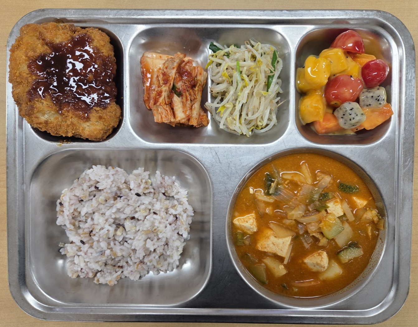 [석식] 친환경잡곡밥, 돈육고추장찌개, 통등심돈까스, 부추숙주나물무침, 열대과일샐러드, 배추김치