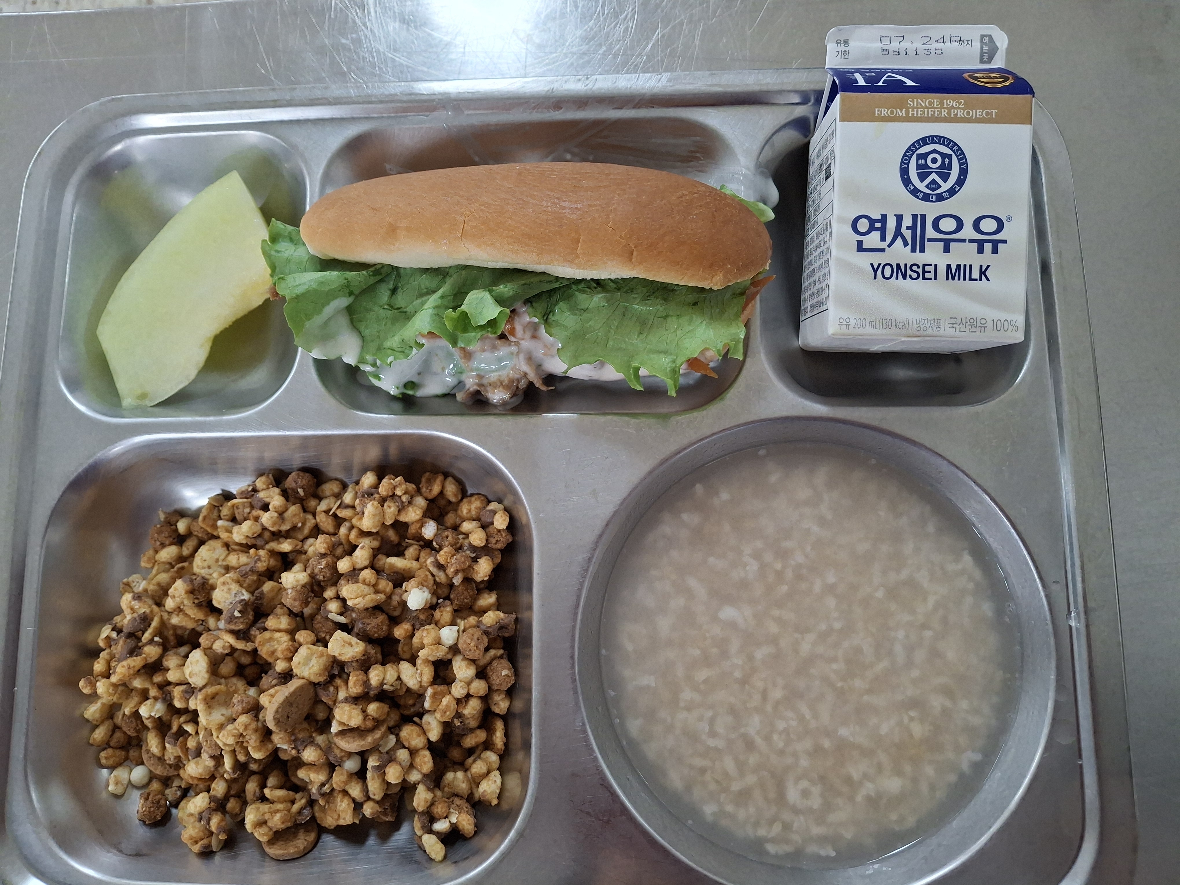[조식] 숭늉, 그래놀라씨리얼다이제, 우유or 요거트, 돼지불고기핫도그, 머스크멜론
