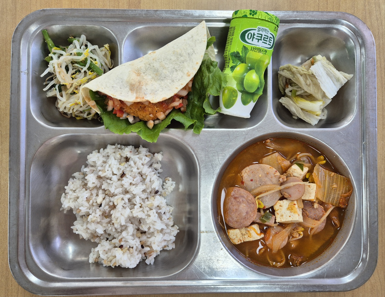 [중식] 친환경잡곡밥, 부대찌개, 매콤치즈타코, 미나리숙주나물무침, 백김치, 거꾸로요구르트