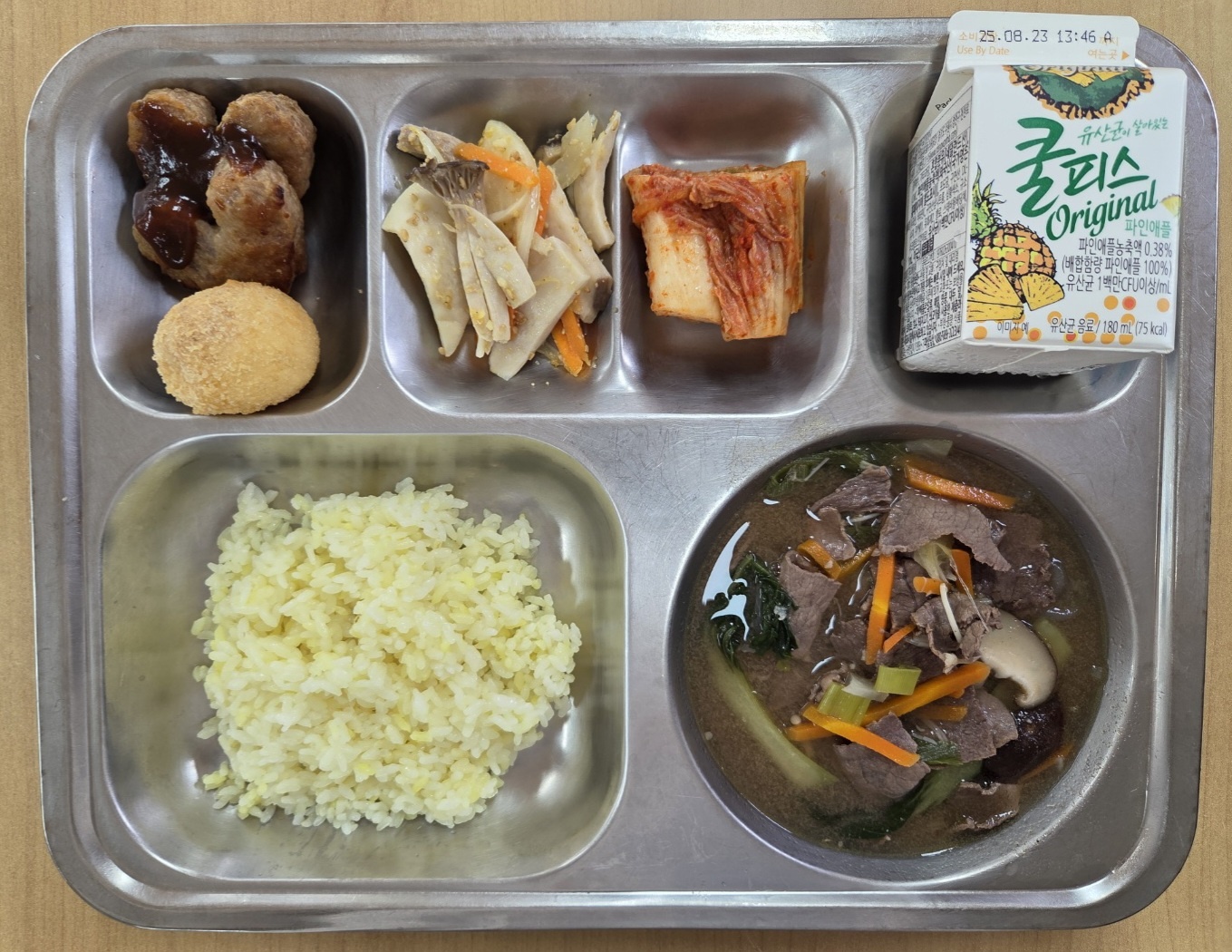 [석식] 강황쌀밥, 한우버섯전골*당면사리, 하트미니함박*치즈볼, 새송이버섯볶음(자율), 배추김치, 쥬시쿨(파인)