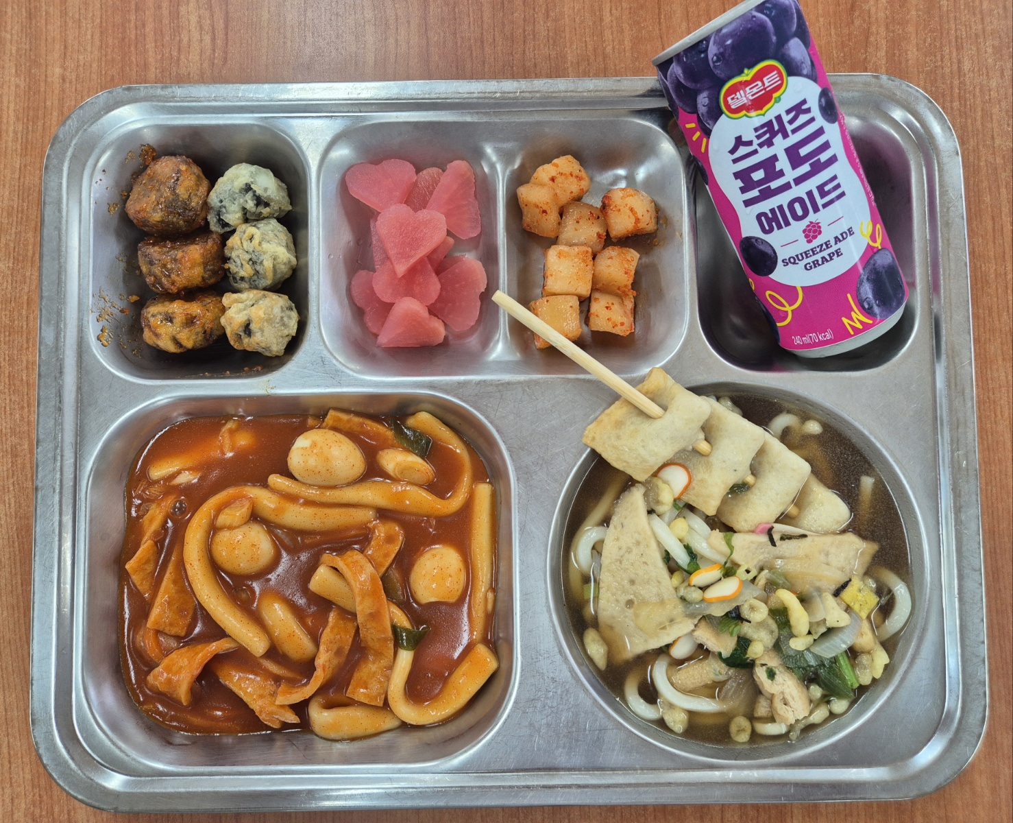 [석식] 어묵꼬치우동, 후루룩밀떡볶이, 순대강정&미니김말이튀김, 하트단무지, 깍두기, 포도드링크