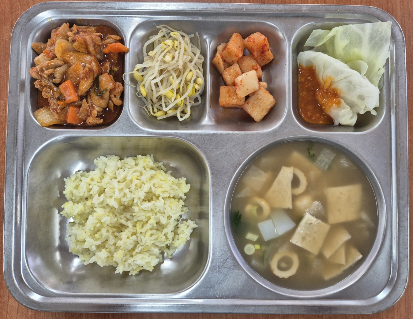 [중식] 강황쌀밥, 모듬어묵국, 춘천식닭갈비, 양배추쌈*쌈장(자율), 콩나물무침, 깍두기