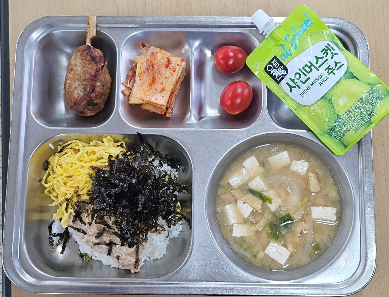 [조식] 참치마요덮밥, 유부장국, 한우한돈츠쿠네, 배추김치, 방울토마토, 샤인머스켓주스