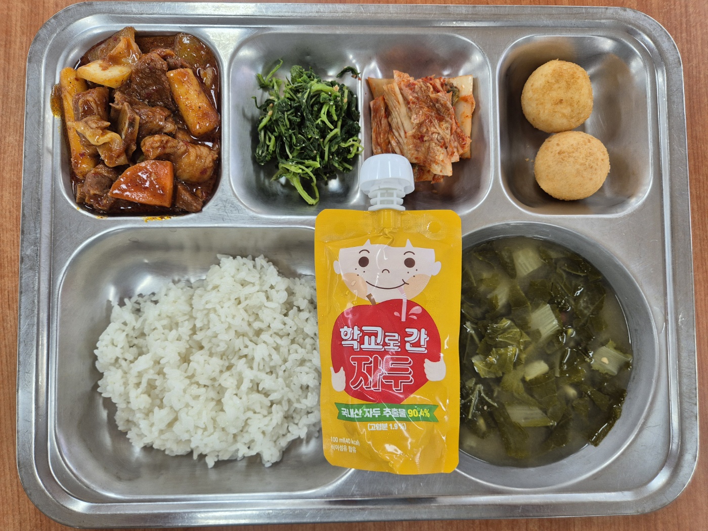 [석식] 친환경찹쌀밥, 시락국, 동인동식찜갈비, 포테이토볼, 깨순나물(자율), 배추김치, 학교로간주스