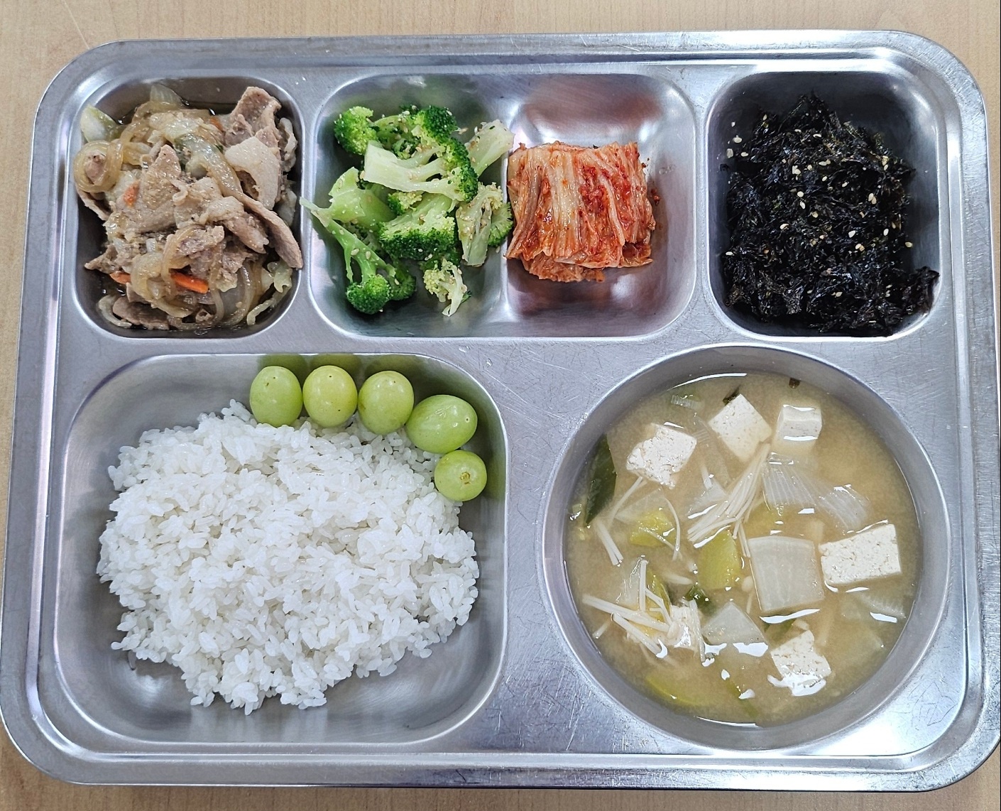 [조식] 친환경찹쌀밥, 팽이버섯된장국, 간장불고기, 시금치나물(자율),파래김자반, 배추김치, 청포도
