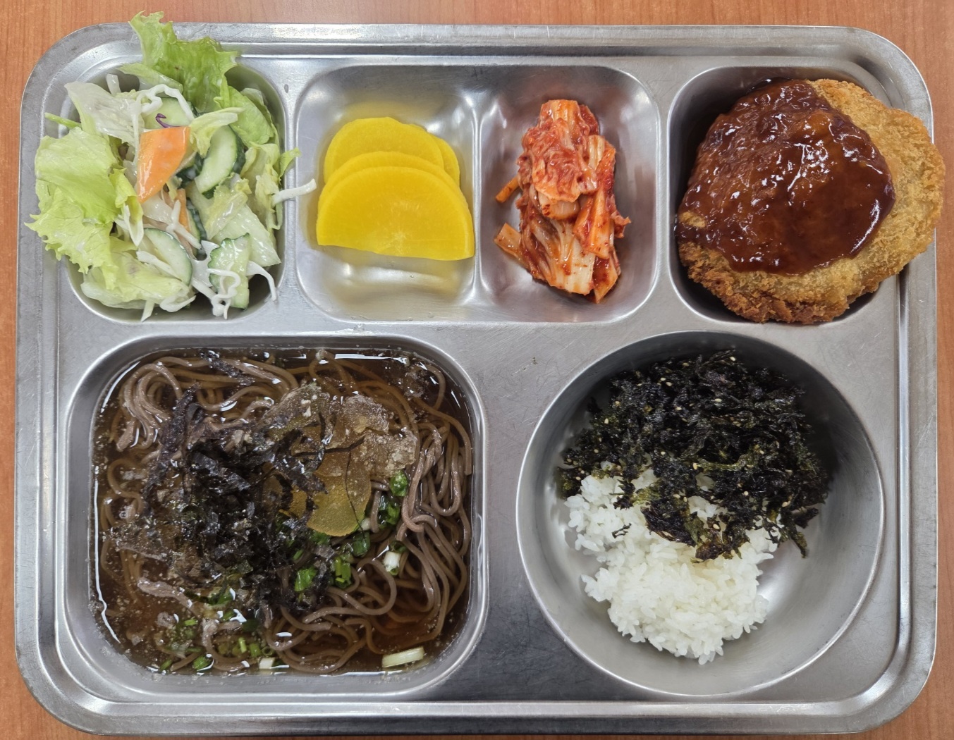 [중식] 미니밥(자율), 냉모밀소바, 고구마치즈돈까스, 양상추샐러드/흑깨D, 단무지, 배추김치
