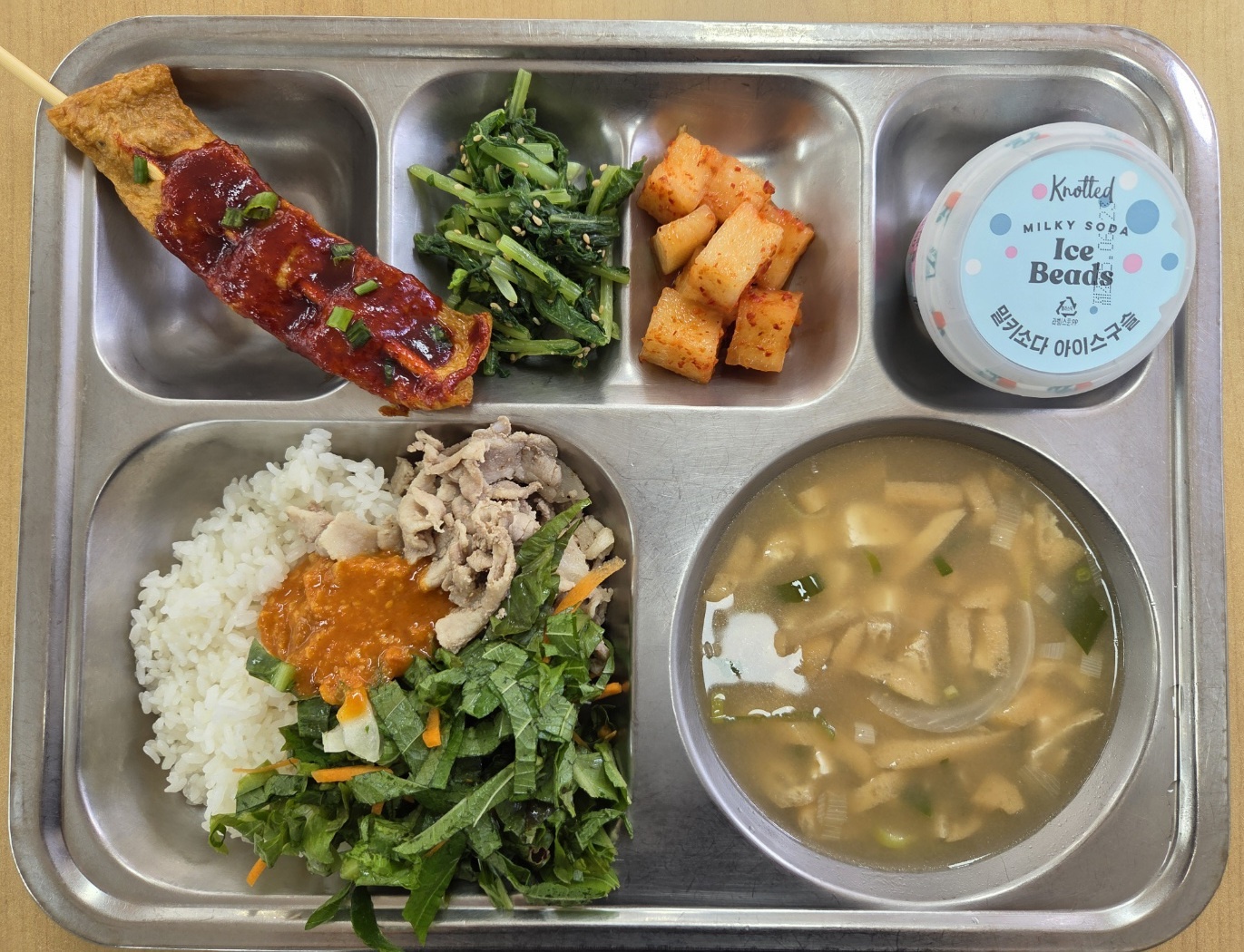[중식] 대패삼겹비빔밥, 유부장국, 매운꼬치어묵, 열무나물(자율), 깍두기, 노티드 구슬아이스크림