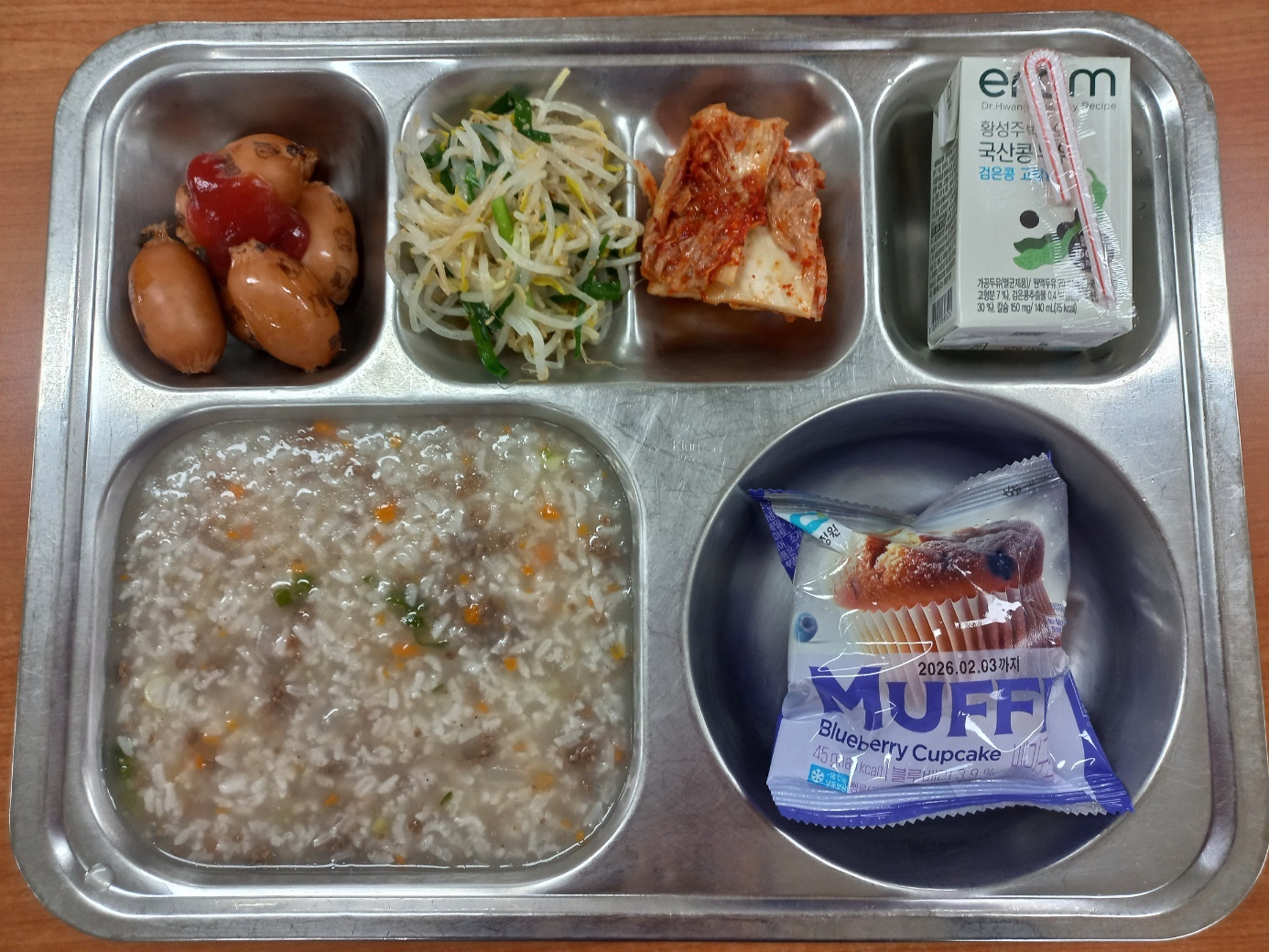 [조식] 쇠고기야채죽, 널응원해비엔나구이*케찹, 부추숙주나물무침, 배추김치, 베리굿컵케이크, 검은콩두유