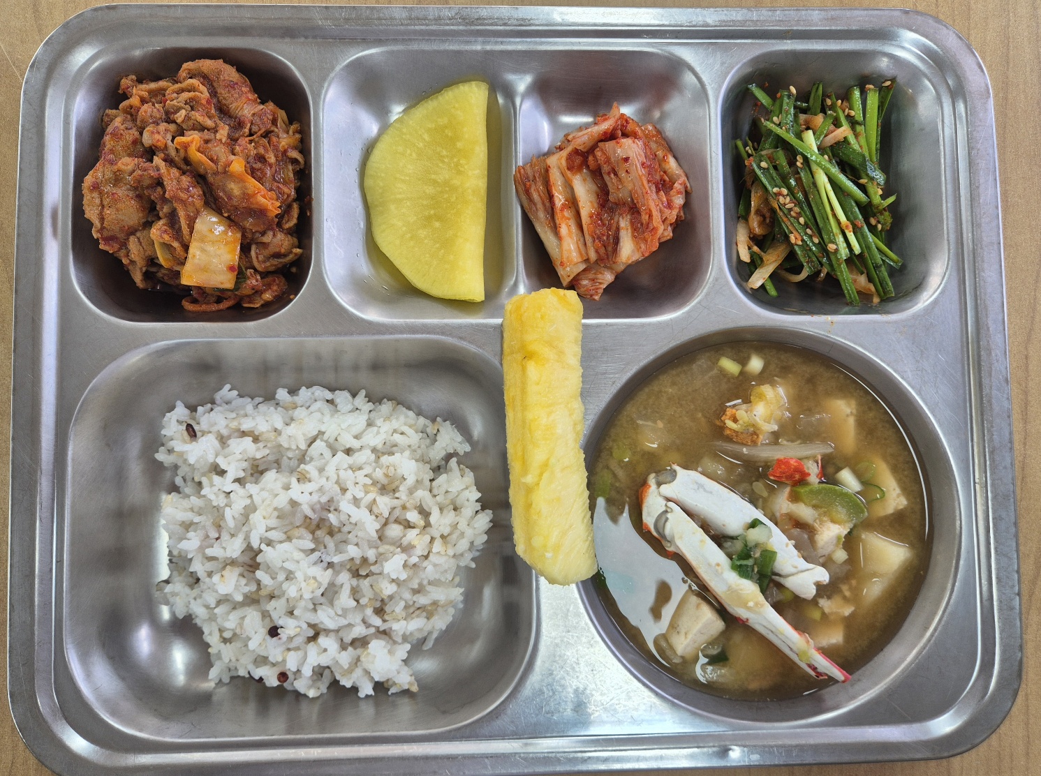 [중식] 친환경잡곡밥, 꽃게두부된장국, 유가네오리불고기, 부추겉절이, 쌈무(완제), 배추김치. 파인애플