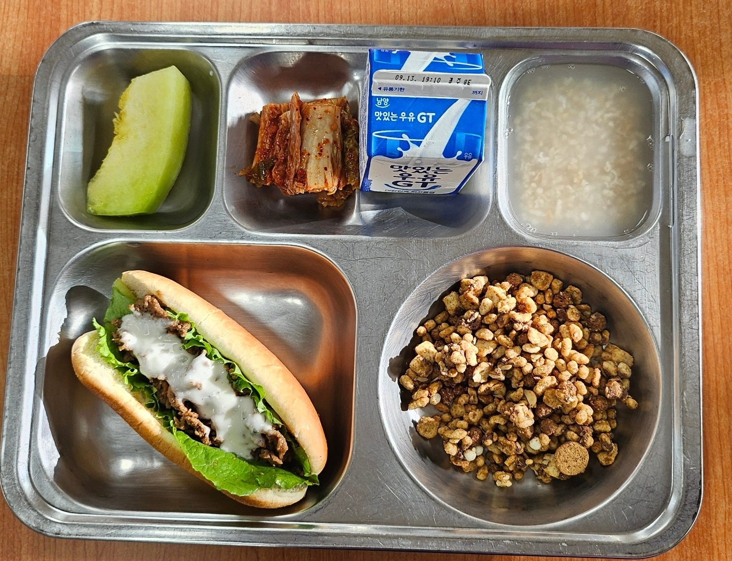 [조식] 돼지불고기핫도그, 그래놀라씨리얼다이제, 우유, 숭늉, 배추김치,머스크멜론
