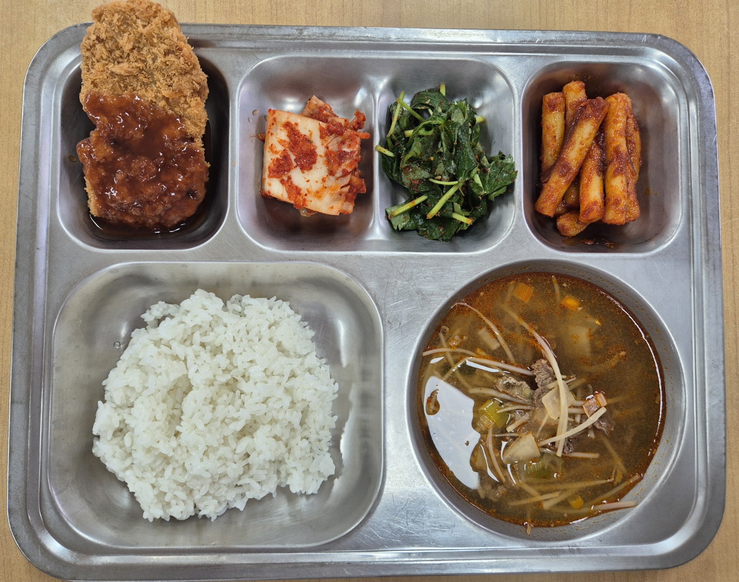 [석식] 친환경찹쌀밥, 쇠고기무국, 생안심카츠/소스, 통인시장기름떡볶이, 참나물겉절이, 배추김치