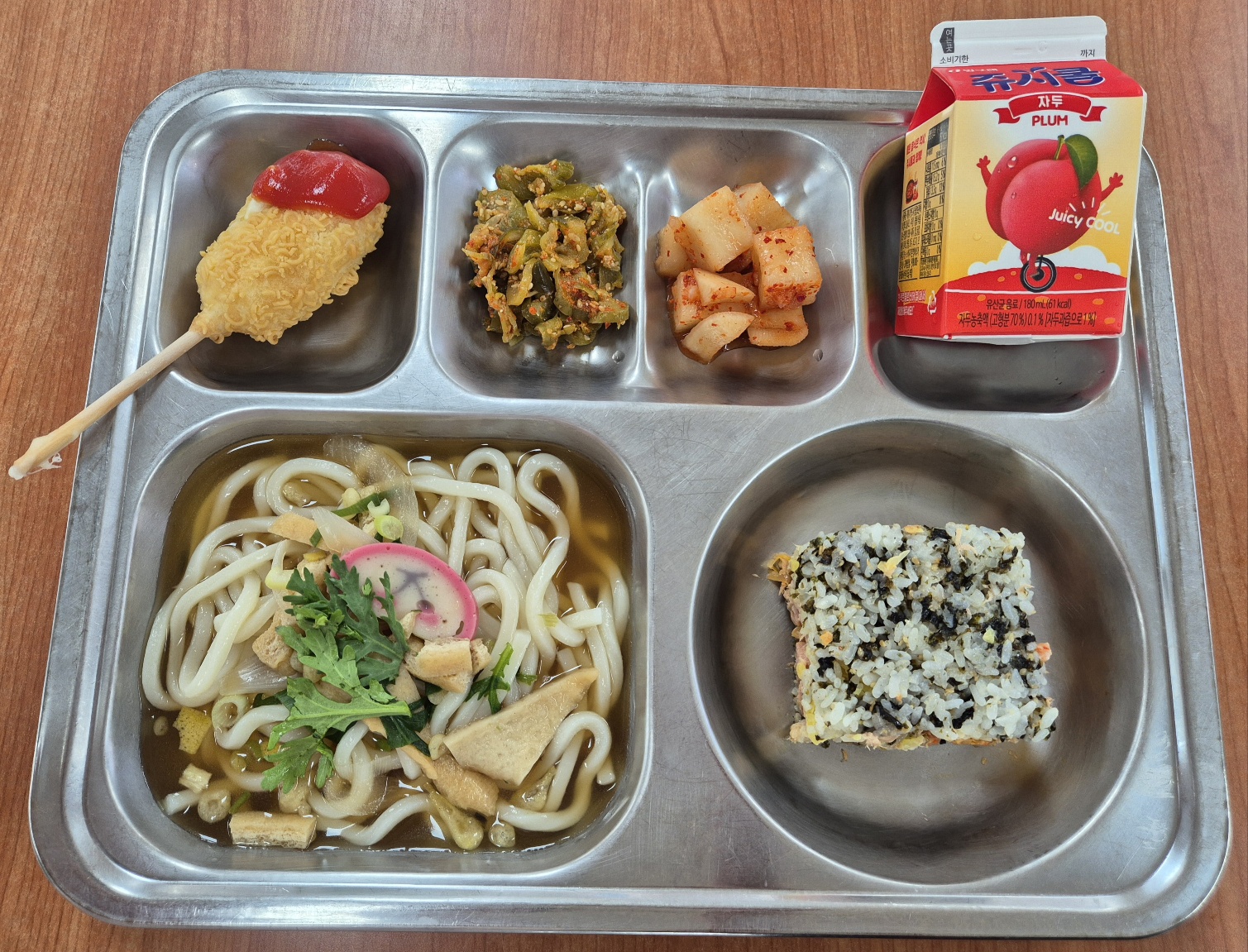 [석식] 밥버거, 어묵유부미니우동, 라면땅치즈핫도그, 오이지무침, 깍두기, 쥬시쿨(자두)