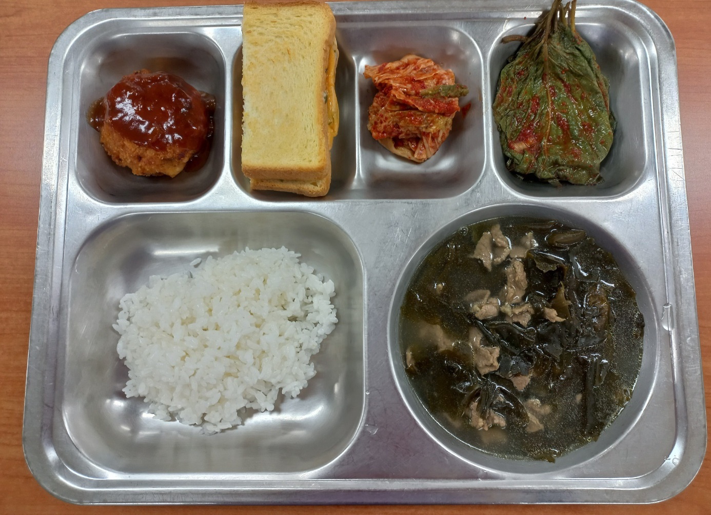 [조식] 친환경찹쌀밥, 쇠고기미역국, 김치치즈피자볼카츠, 양념깻잎지, 배추김치, 대파크로크무슈