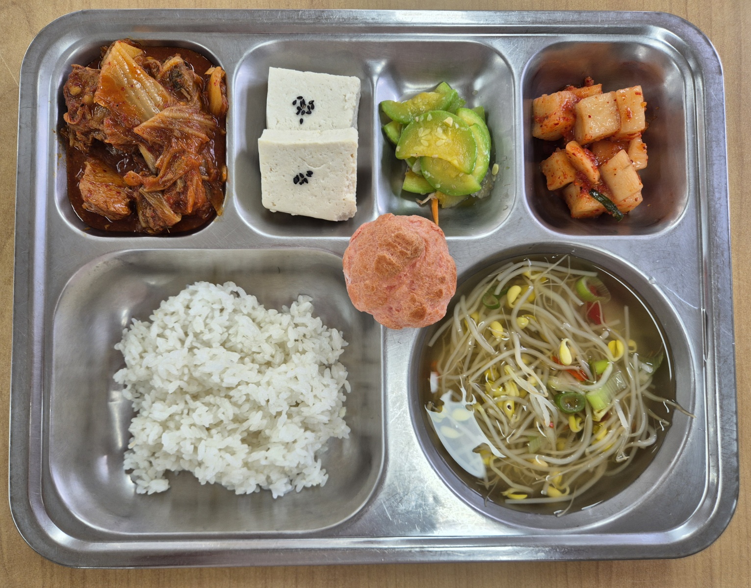 [중식] 친환경찹쌀밥, 맑은콩나물국, 돼지고기김치찜, 온두부, 애호박나물, 깍두기, 딸기앙슈