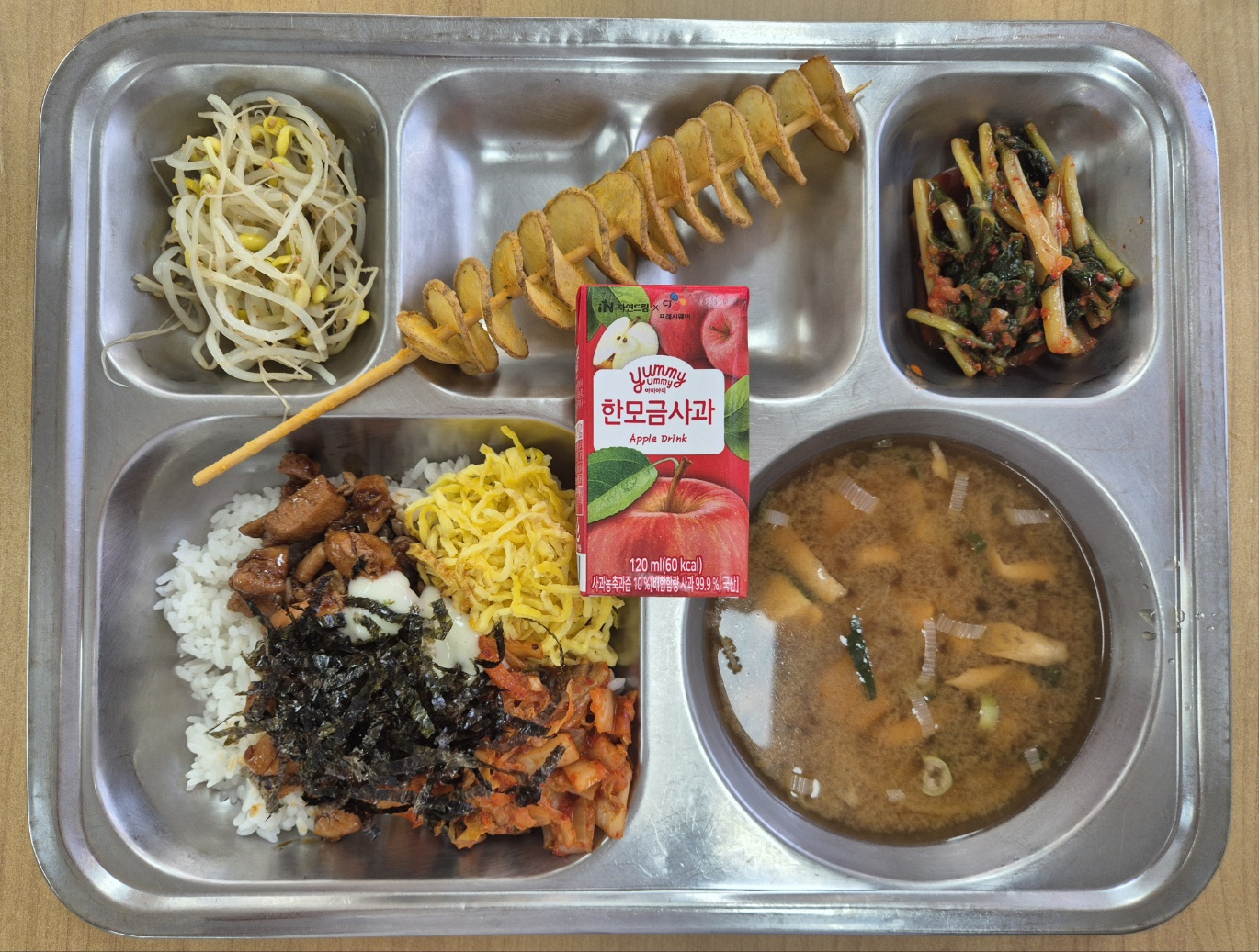 [중식] 깐부치밥, 유부장국, 회오리감자, 콩나물무침, 사과한모금, 열무김치