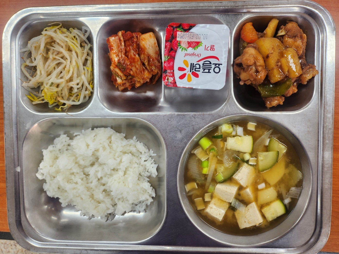 [조식] 친환경찹쌀밥, 두부된장국, 닭봉간장조림, 숙주나물무침, 배추김치, 호상요구르트