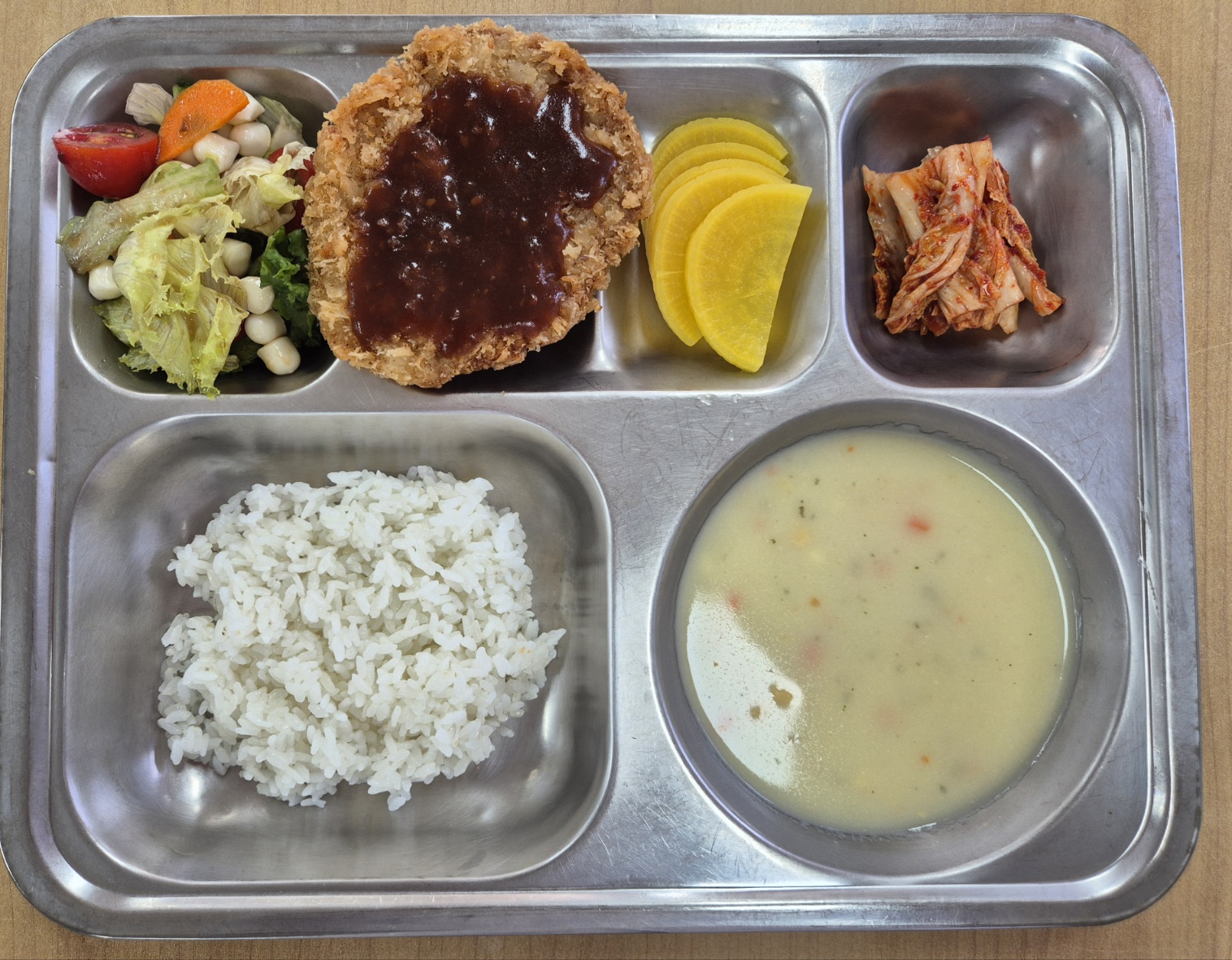 [중식] 친환경찹쌀밥, 옥수수크림스프, 남산식왕돈까스, 구슬치즈샐러드, 단무지, 배추김치