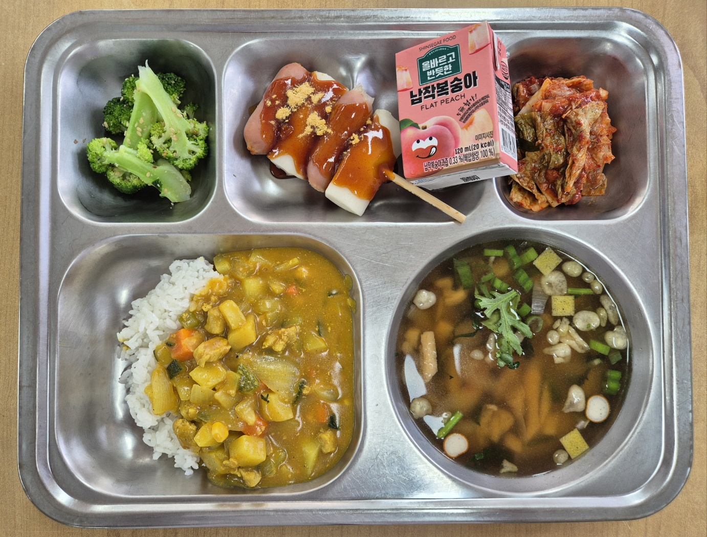 [중식] 인델리카레라이스, 가쓰오장국, 뿌링클소떡꼬치, 브로콜리무침(자율), 납작복숭아주스. 배추김치