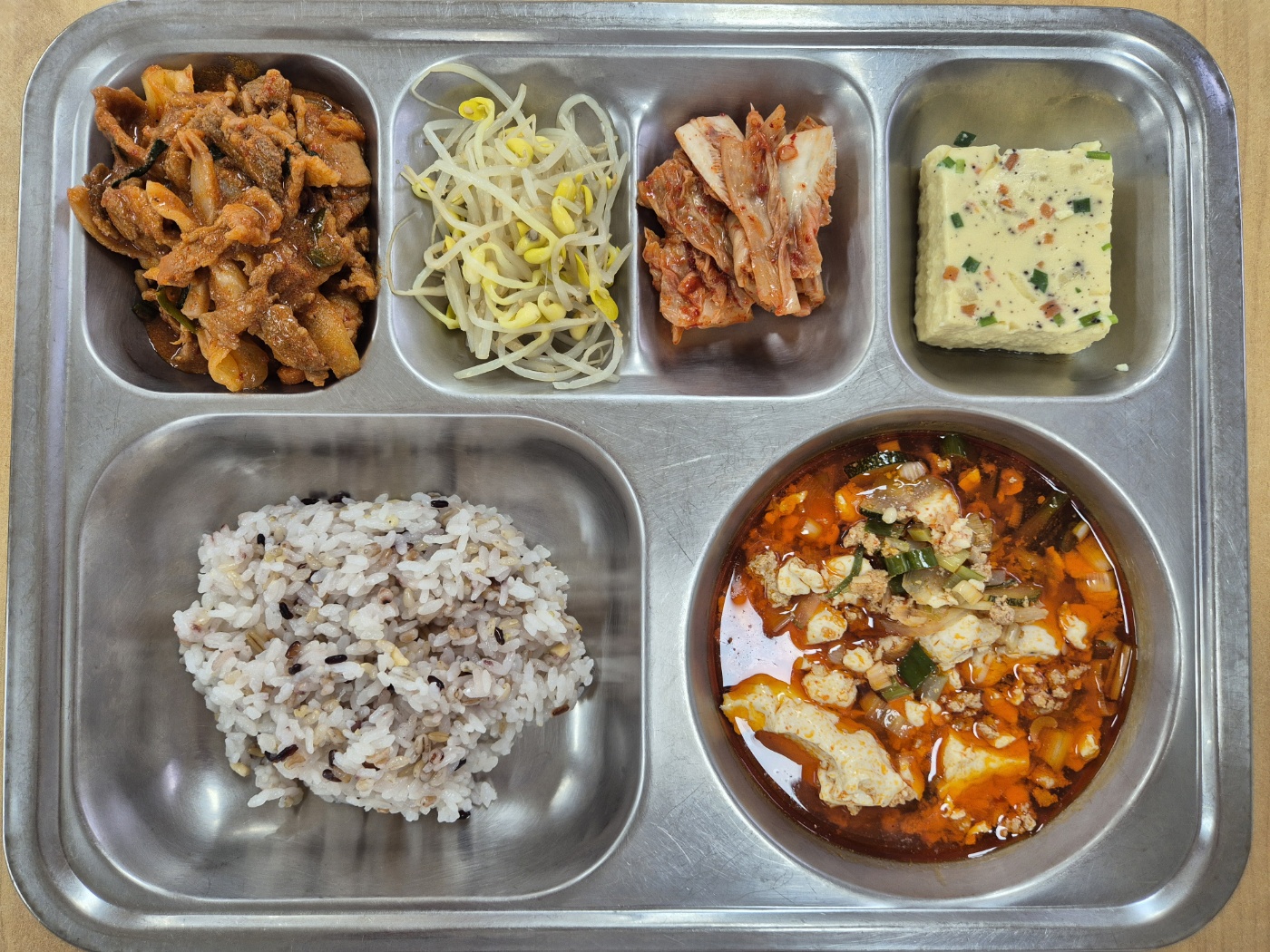 [석식] 친환경잡곡밥, 순두부찌개, 오삼불고기, 계란찜, 시금치나물(자율), 배추김치
