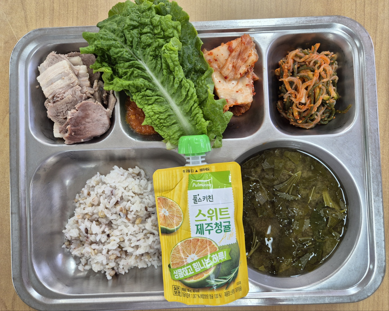 [중식] 친환경잡곡밥, 건새우아욱국, 돼지고기수육, 상추쌈*쌈장(자율), 실곤약초무침, 배추김치, 스위트청귤주스