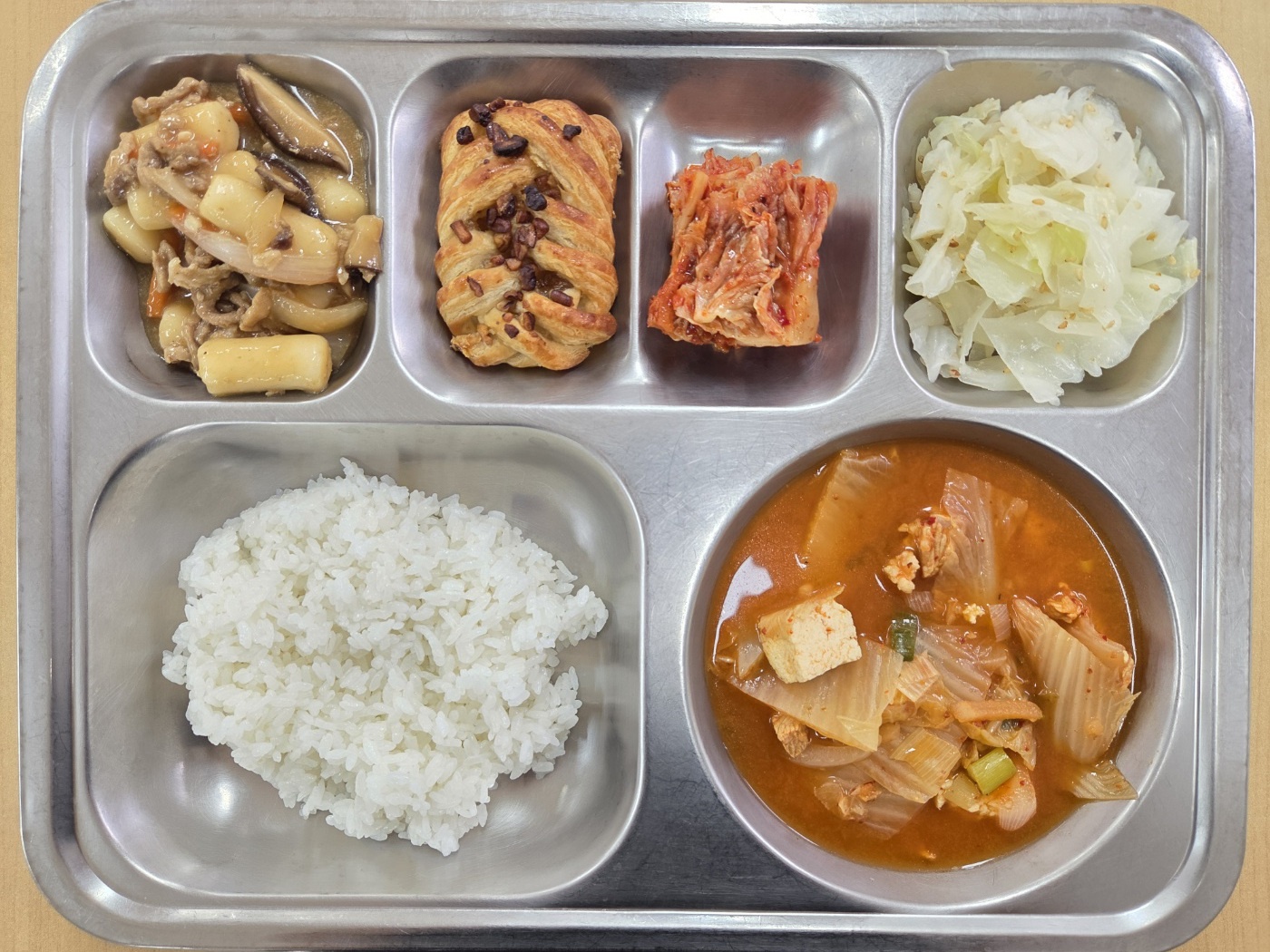 [석식] 친환경찹쌀밥, 돈육김치찌개, 궁중떡볶이, 양배추나물무침, 배추김치, 미니메이플피칸파이