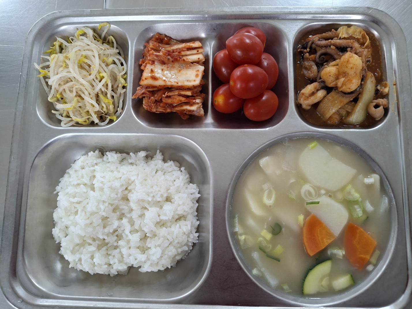 [조식] 친환경찹쌀밥, 감자수제비국, 쭈꾸미볶음, 숙주나물무침, 배추김치, 방울토마토