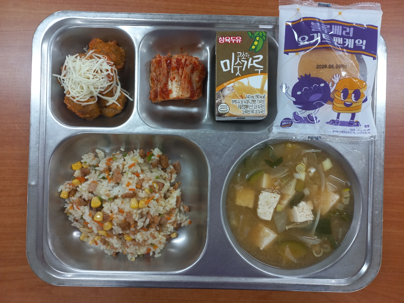 [조식] 스팸야채볶음밥, 팽이버섯된장국, 눈꽃로제미트볼, 배추김치, 미숫가루두유, 블루베리요거트팬케잌