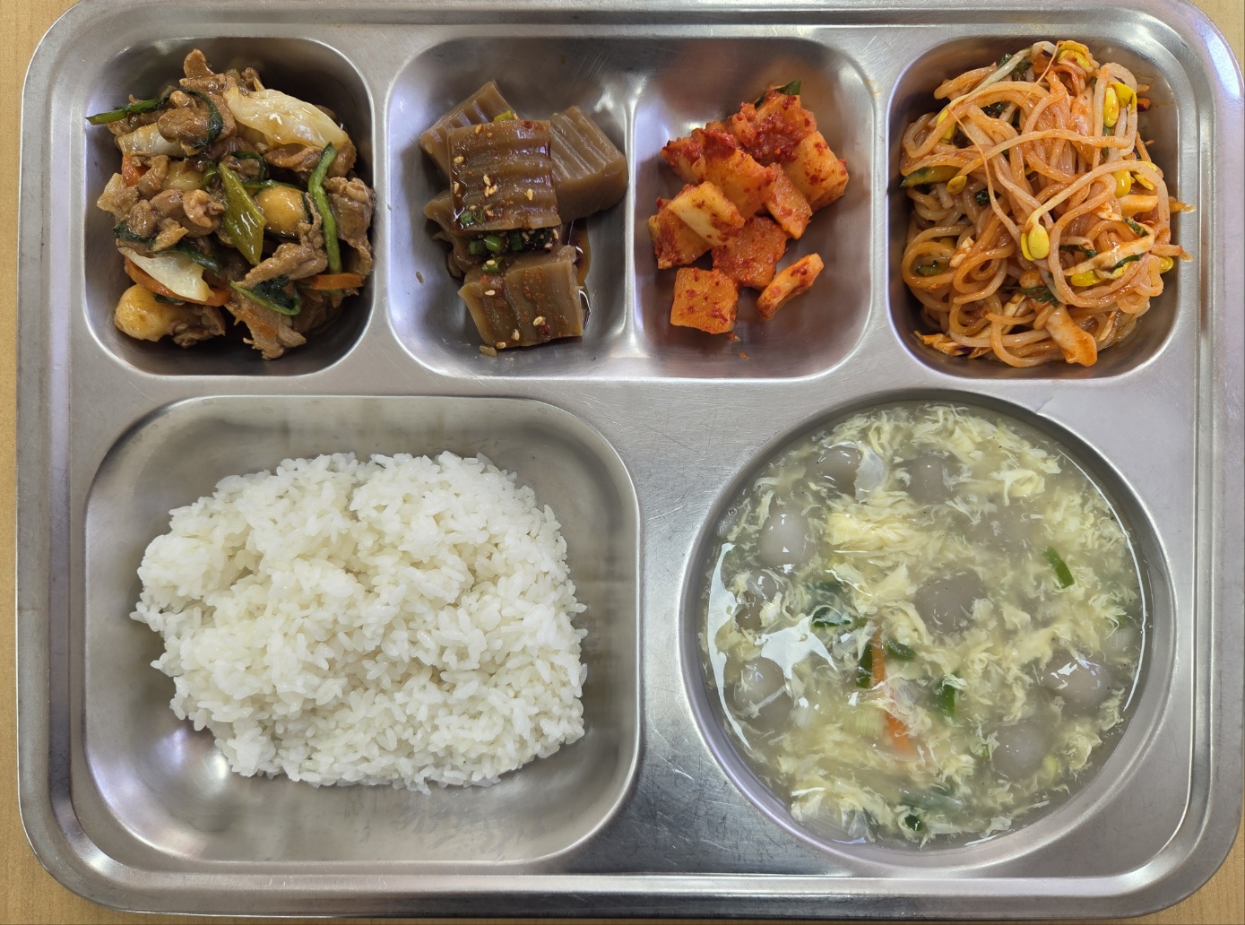 [중식] 친환경찹쌀밥, 새알심만두국, 쫄면야채무침, 오리간장불고기, 도토리묵&양념장, 깍두기