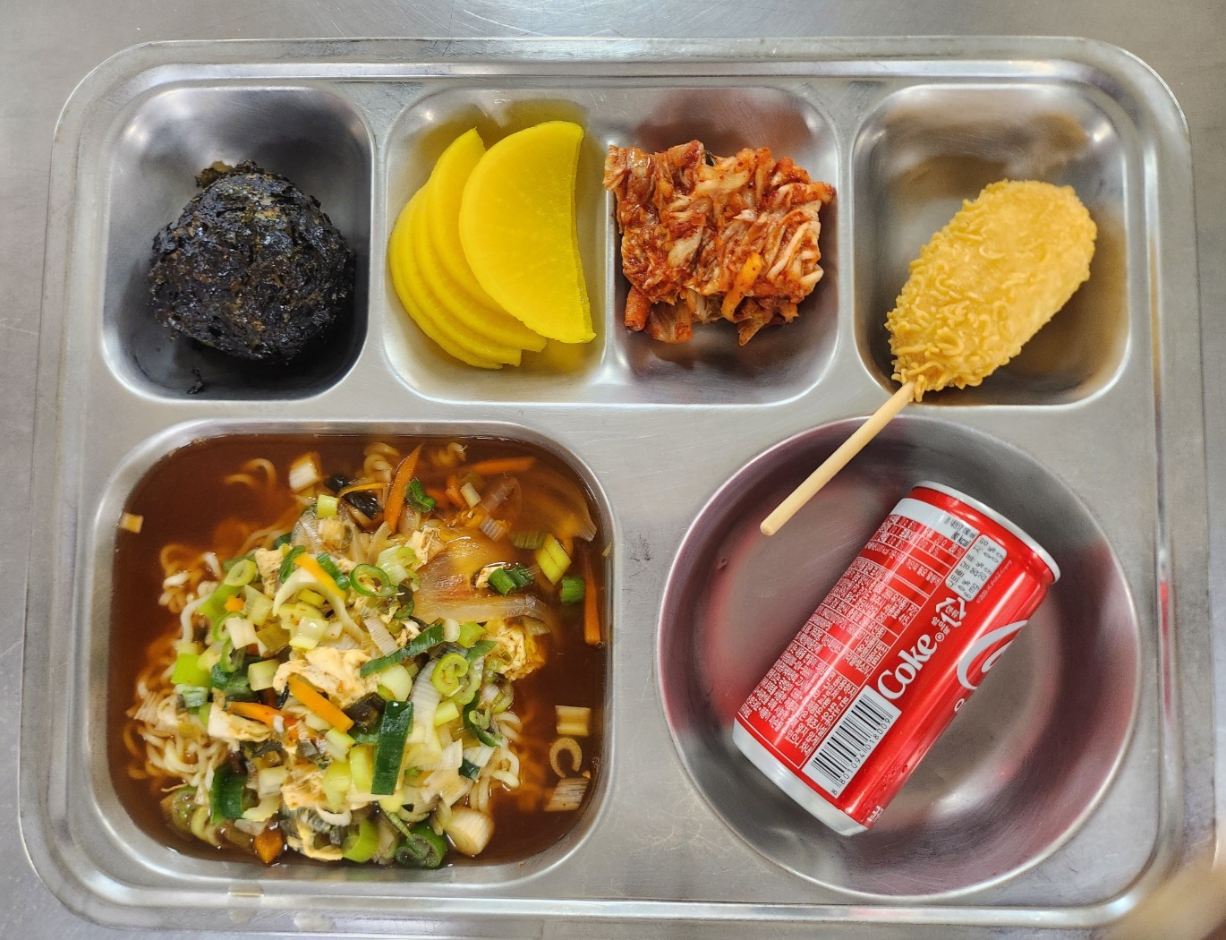 [석식] 미니주먹밥, 용남고라면, 라면땅치즈핫도그,단무지,배추김치, 탄산음료