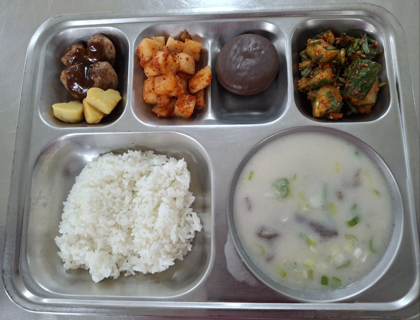 [조식] 친환경찹쌀밥, 한우사골곰탕*소면, 하트미니함박*하트감자, 오이소박이,깍두기, 아몬드봉봉크림파이