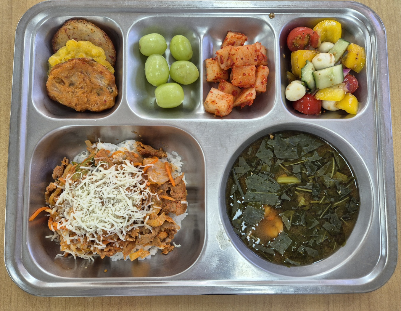 [중식] 눈꽃치즈제육덮밥, 새우살아욱국, 모듬전, 지중해식샐러드, 깍두기, 청포도